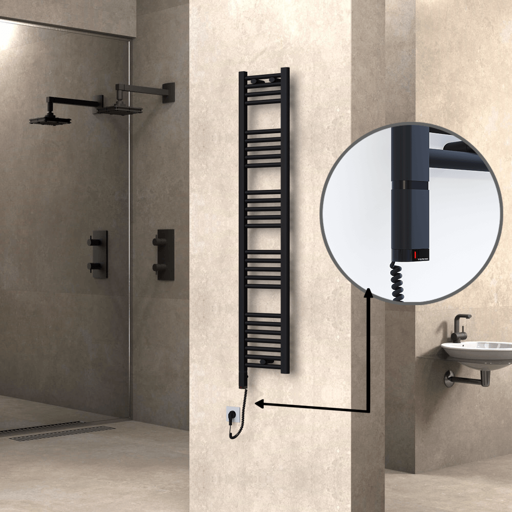 HAITI model, 300 Watt, 300x1500 mm Ölçüsündeki, Çelik malzemeden üretilmiş Mat Siyah Elektrikli havlupanınız için ihtiyaç duyacağınız tüm havlupan ve elektrik kiti özelliklerini bu sayfada bulabilirsiniz.
